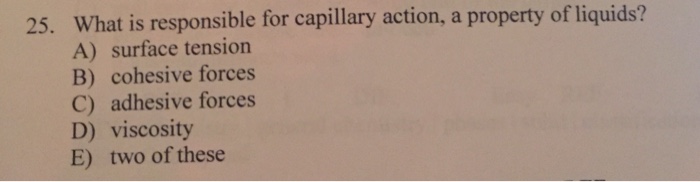 What is responsible for capillary action a property of liquids. 1 What is responsible for capillary action a property of liquids. A surface tension B cohesive forces C adhesive forces D viscosity E two of these 25.