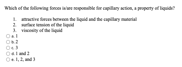 . 1 and 2 e. Attractive forces between the liquid and the capillary material. 1attractive forces between the liquid and the capillary material 2surface tension of the liquid 3viscosity of the liquid a.